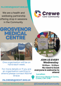 Representation from CWP (Cheshire and Wirral Partnership) will be present at Grosvenor Medical Centre, offering information and support to the community of Crewe. Please see the attached poster for more information.